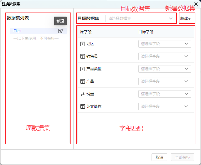 | 原数据集 | 选择需要替换的原数据集 支持预览数据集:悬浮数据集行时,右侧出现预览按钮 注:多选数据集进行替换时,模板中未使用的数据集不支持替换,灰化不可选中。 | |