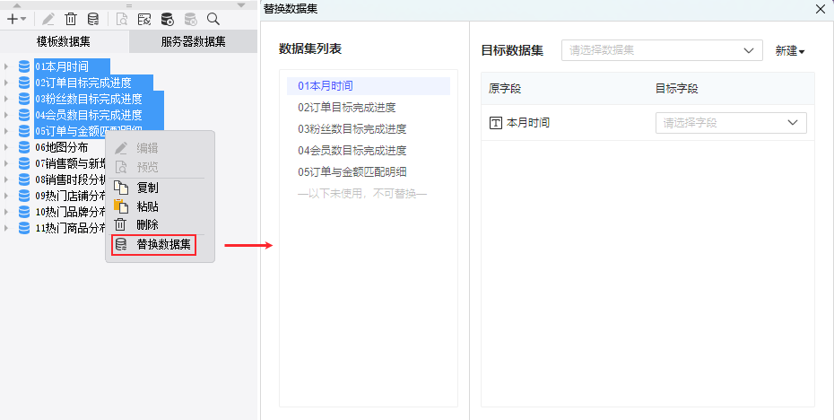 或在数据集配置区域,选中需要替换的数据集后,右键工具栏中可选择「替换数据集」,也可点击数据集工具栏中「替换数据集」按钮进行替换,如下图所示: