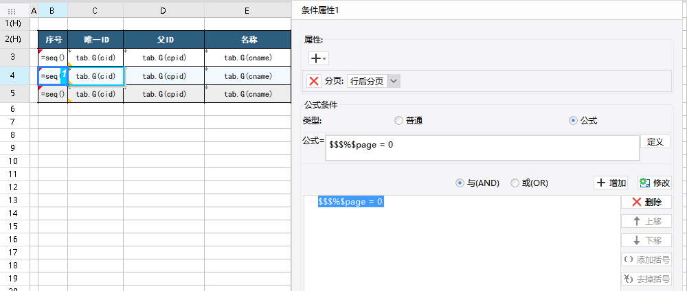 1)序号序号列,设置父单元格为唯一ID列进行拓展,对拓展的每一行的序号列都设置条件属性分页属性,公式为:$$$ % $page = 0