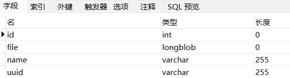 1)在 MYSQL 数据库中创建一张数据库表「文件」,包含字段 (id[int]、file[longblob]、name[varchar])。如图所示: