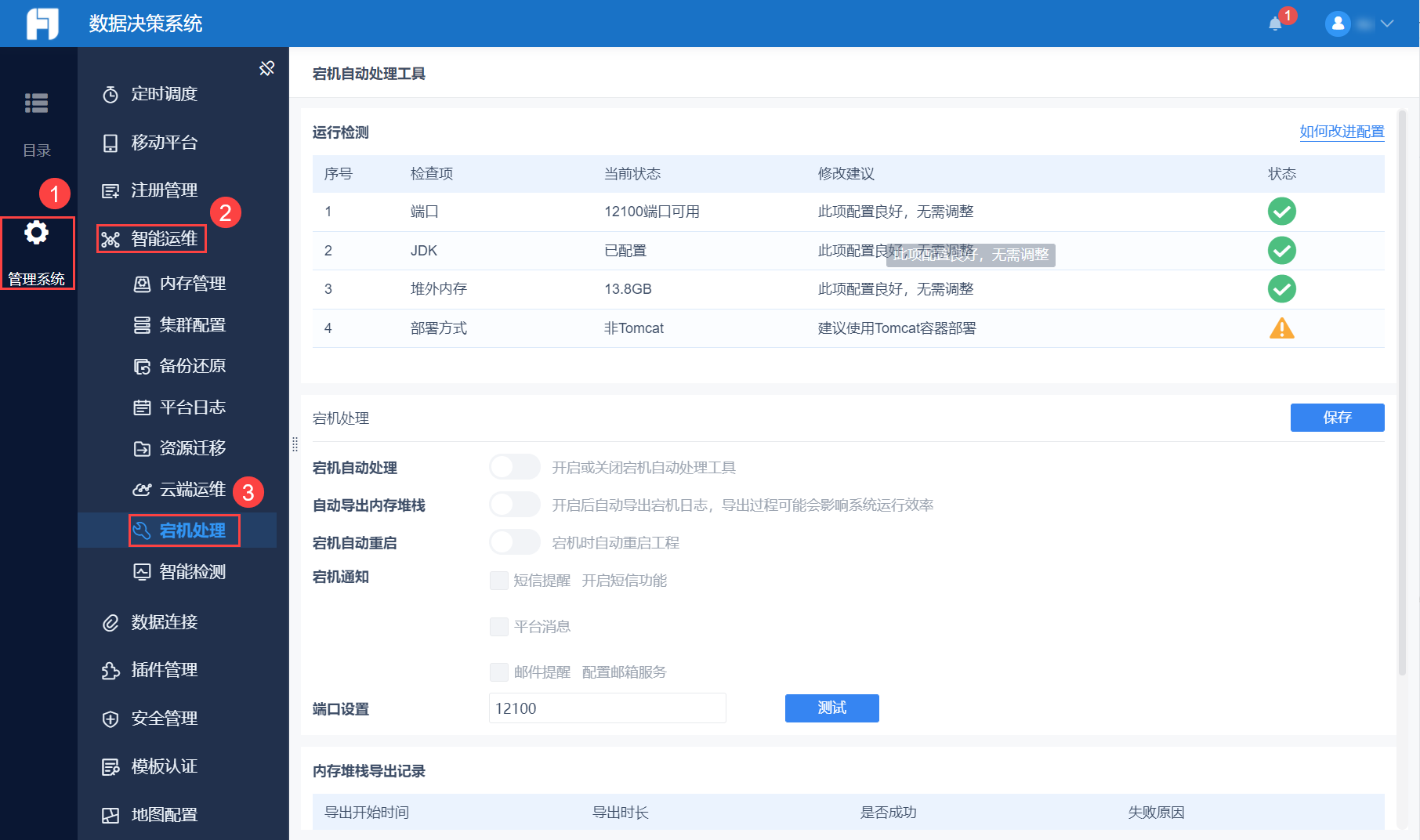 | 3 | 堆外内存 | 宕机自动处理工具运行时需要一些内存,堆外内存不足说明内存配置极度不合理,不仅无法使用宕机自动处理功能,还有严重的宕机风险和隐患,所以需要检测内存配置。 | 显示堆外内存大小 | 此项配置良好,无需调整(堆外内存大于 300M) |