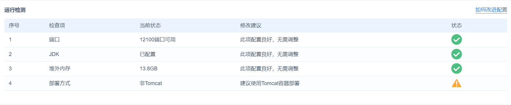 | 4 | 部署方式 | 检测是否为 Tomcat 部署、是否为设计器部署,对于非 Tomcat 容器部署以及设计器部署的用户,不支持此功能。 | Tomcat | 此项配置良好,无需调整 |