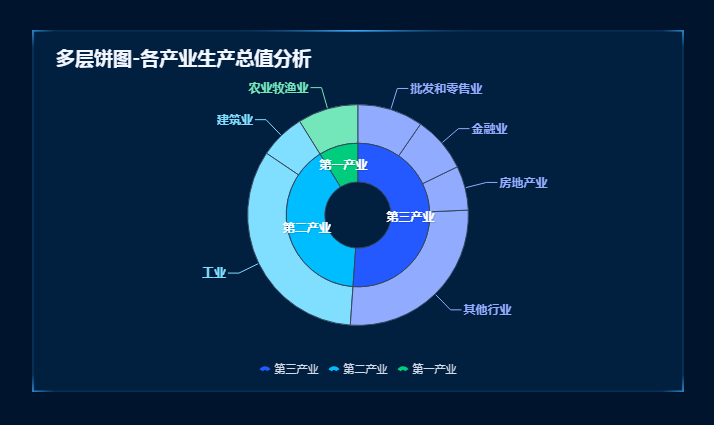 多层饼图适合展示具有父子关系的复杂树形结构数据,如区域数据,公司上下层级等等。多层饼图的展示效果如下图所示:
