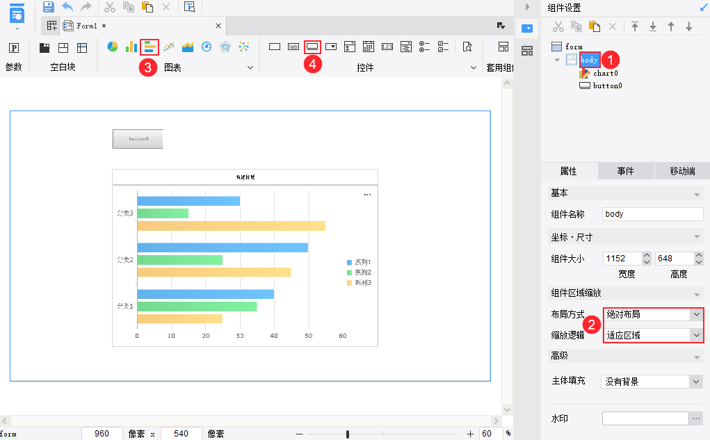 将 body 布局方式修改为「绝对布局>适应区域」,再将条形图和按钮控件拖入 body 中。如下图所示: