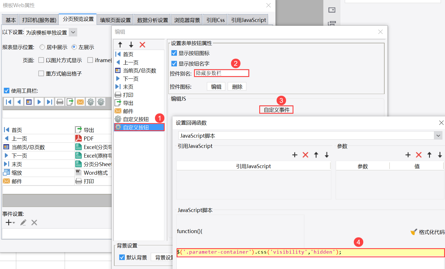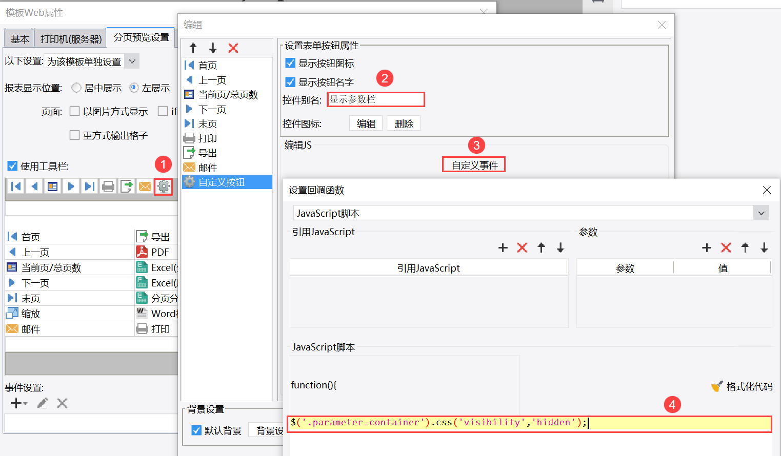 利用分页预览设置中,增加自定义按钮的“自定义事件”来控制参数面板的显示和隐藏效果。