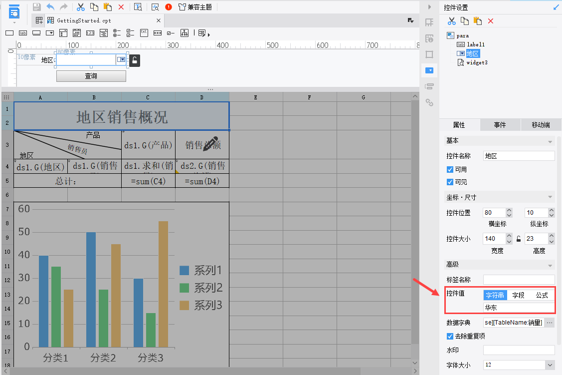 比如使用第一张报表,给参数面板上地区控件赋默认值「华东」,如下图所示: