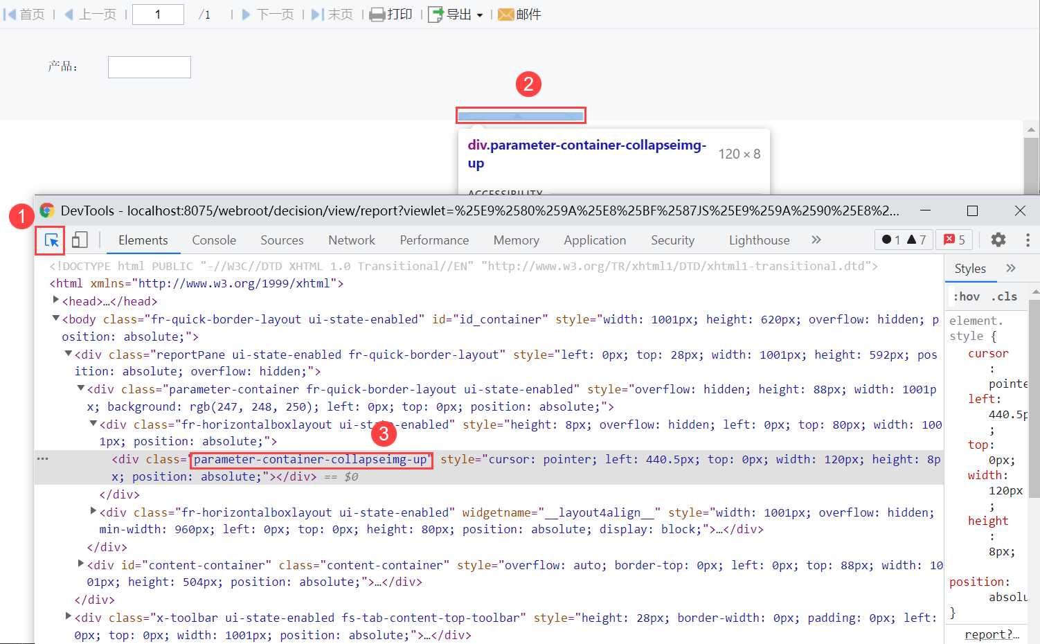 预览报表,然后按 F12 或者找到浏览器的开发人员选项,然后使用查找元素选择三角按钮,查看其中 class 属性值。如下图所示: