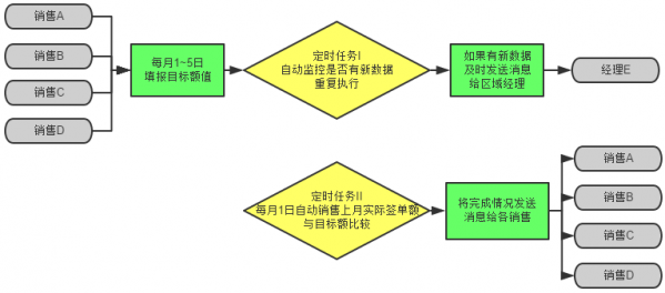 这个时候,需要自动给销售A、D推送消息告诉他们没有完成目标,而给销售B,C推送消息告诉他们完成了目标。