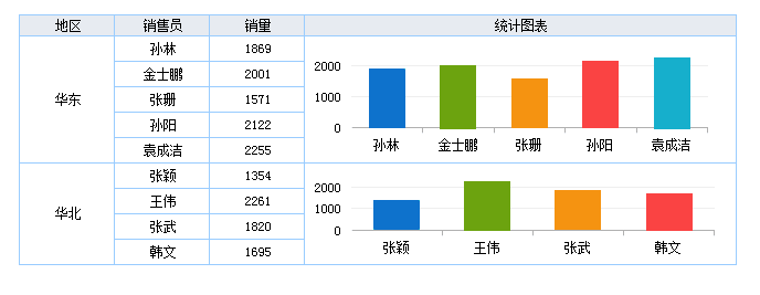 图表作为单元格元素插入到报表中,就可以通过单元格的父子关系,跟随父格的扩展自动生成相应的图表,而不需要对每组数据单独制作对应的图表。