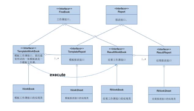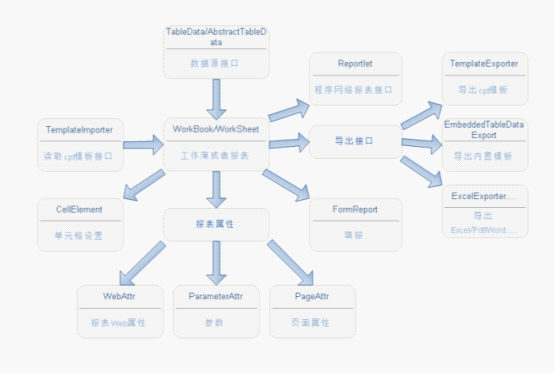 由于每个部分各自包含了很多属性,比如可以设置单元格的前景、背景、边框、字体、字号等;又比如每个WorkSheet中可以添加,删除单元格、可以设置每个sheet的页面属性、可以给每个sheet中添加图表悬浮元素等;再比如可以对WorkBook进行执行获得结果并导出成各种格式、可以进行打印、添加工具栏等等。正是这样,FineReport提供了丰富的API供程序员进行调用,对报表进行深入的控制,来实现其个性化的需求。以下我们用简图来说明FineReport包含的所有开放的api。