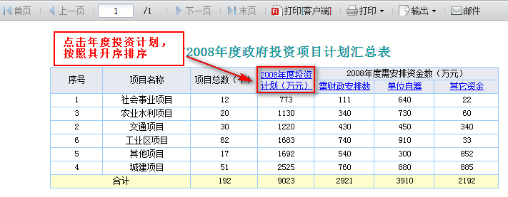 点击年度投资计划时,按照年度投资计划进行排序,点击财政安排数时按照财政安排数排序,点击单位自筹时按照单位自筹排序。