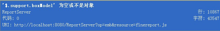 在将报表集成到您自己的页面中时,调用finereport.js内置方法时如调用FR.doURLPDFPring()方法,JS会出现:$.support.boxModel为空或不是对象的错误,如下图所示: