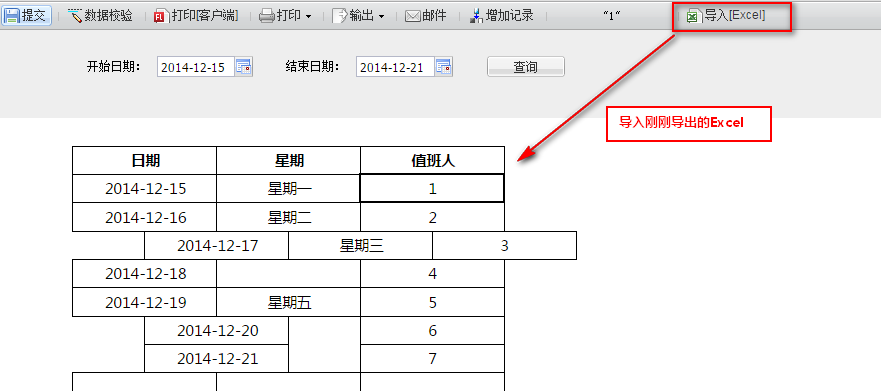 回到设计器界面,根据导入行式报表中的操作步骤,为该模板的工具栏添加,添加完成之后,重新填报预览该模板,点击导入Excel,选择刚刚导出的Excel文件,即可看到如下图所示效果,位置错乱: