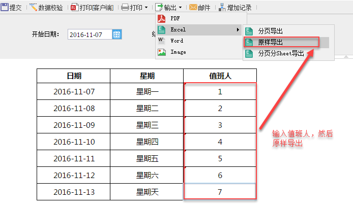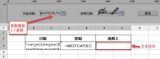 合并B3和C3单元格,其值为:=range(date(year($starttime),month($starttime),day($starttime)),date(year($endtime),month($endtime),day($endtime))),合并D3和E3单元格,其值为=WEEKDAY(B3),合并F3和G3单元格,设置其控件类型为文本控件。