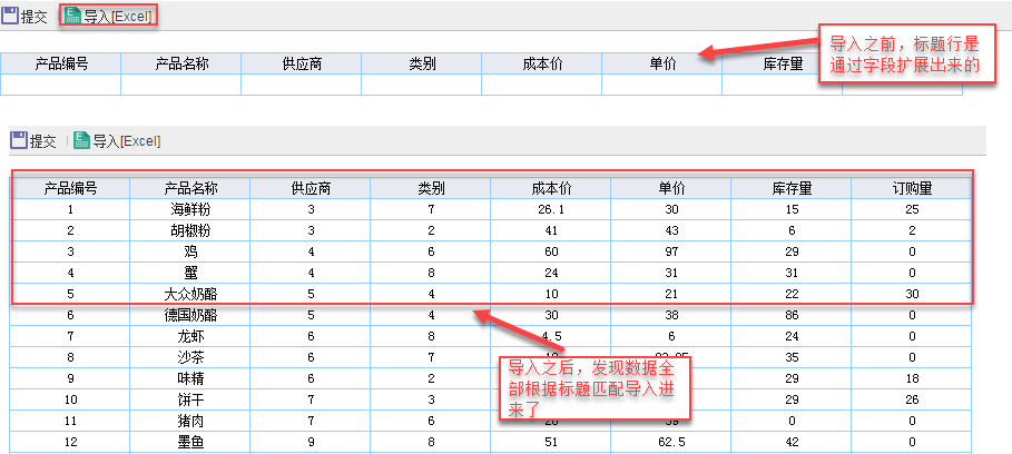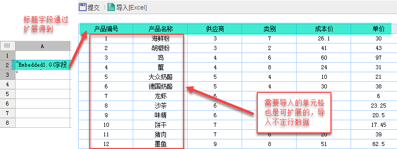 Excel双向导入是指标题行列是从单元格扩展得到的,并将导入数据的单元格也是可扩展的,如下图所示效果,标题字段通过横向扩展得到,导入数据的单元格纵向扩展,导入不定行数据: