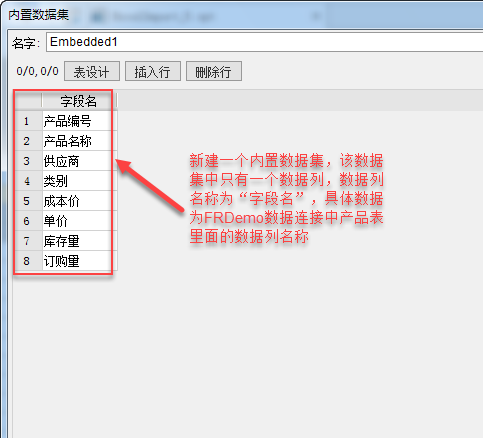新建一个模板,添加,该数据集中只有一列数据,存储的是产品表中的字段名称,如下图: