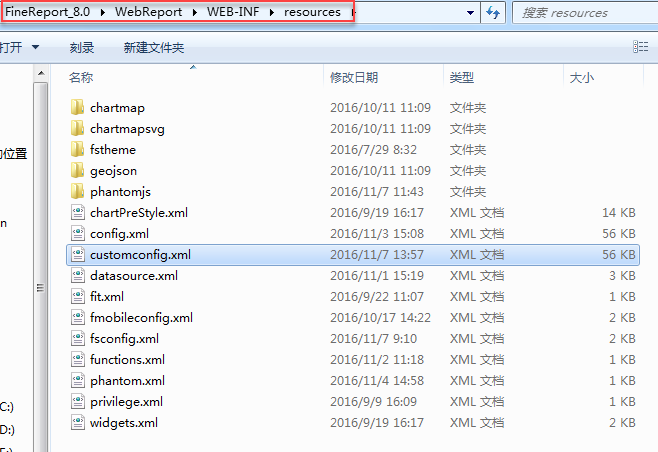 打开%FR_HOME%\WebReport\WEB-INF\resources下面的customconfig.xml文件,如果没有该文件,则复制config.xml至该文件夹中,并重命名为customconfig.xml,如下图: