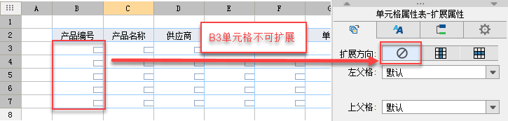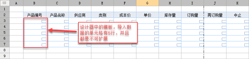 打开模板%FR_HOME%\WebReport\WEB-INF\reportlets\doc\SpecialSubject|\ExcelImport\ExcelImport_1.cpt,修改如下图,设置B3单元格不可扩展,并复制第3行,粘贴四遍,使第4行至第7行与第3行一模一样: