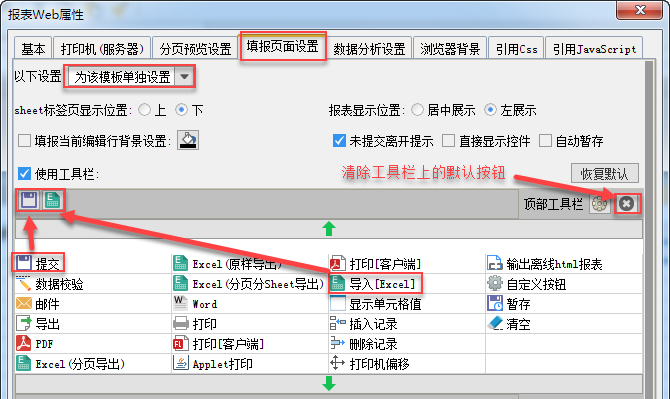 默认填报工具栏是没有导入Excel按钮的,点击模板>模板web属性>填报页面设置,,勾选,为该报表单独设置工具栏,清空工具栏,然后在按钮面板中双击按钮和按钮,将这两个按钮添加到顶部工具栏中,如下图: