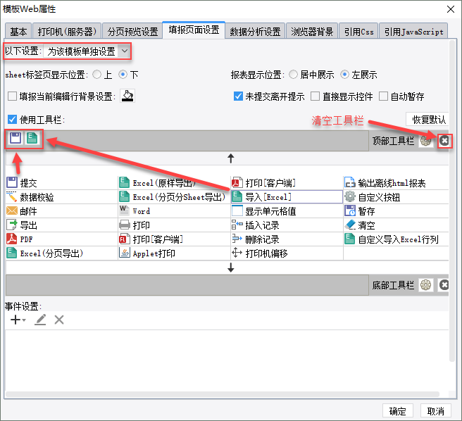 默认填报工具栏是没有导入Excel按钮的,点击模板>模板web属性>填报页面设置,,勾选,为该报表单独设置工具栏,清空工具栏,然后在按钮面板中双击按钮和按钮,将这两个按钮添加到顶部工具栏中,如下图: