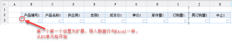 上图中我们可以看到,Excel中第一行数据(不包括标题)在B3~K3中,在填报模板中,导入数据的单元格也要在B3~K3,单元格从上到下扩展,并添加控件: