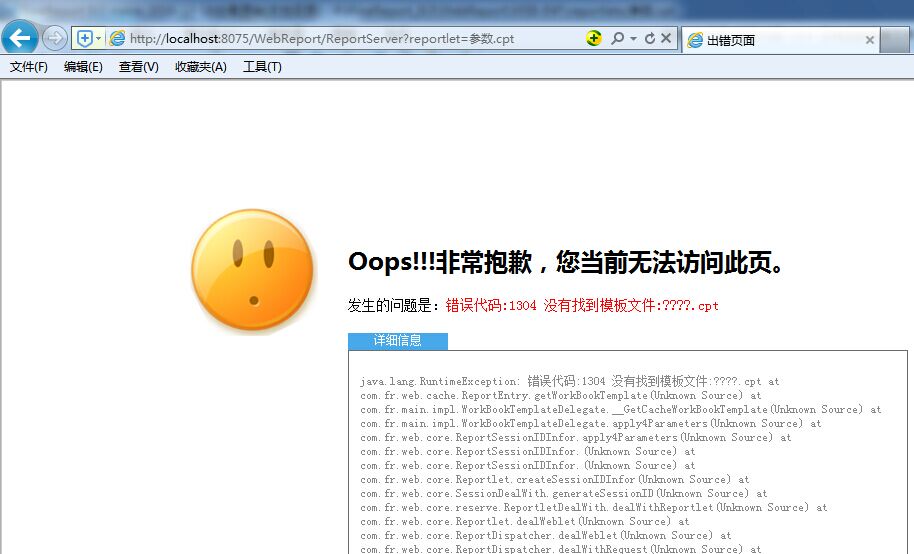 比如在URL中输入访问某张报表,如http://localhost:8075/WebReport/ReportServer?reportlet=参数.cpt ,就会报如下错误信息: