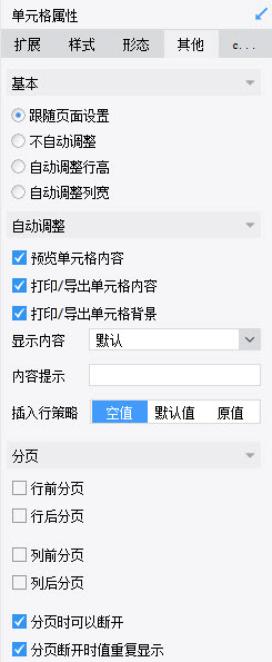 可选择是否自动调整该单元格的行高或者列宽,默认跟随页面设置即自动调整。