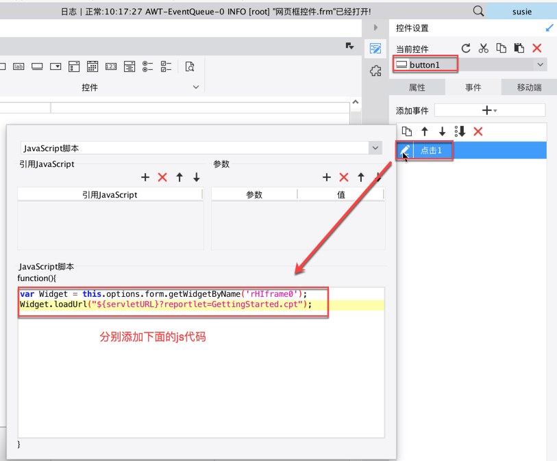 假设决策报表里有一个网页框控件,控件名为rHIframe0;同时有三个按钮控件,分别给按钮控件添加下面的点击事件: