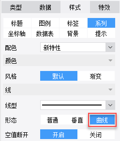选中图表,在右侧选择样式>系列,线-形态,选择“曲线”,如下图: