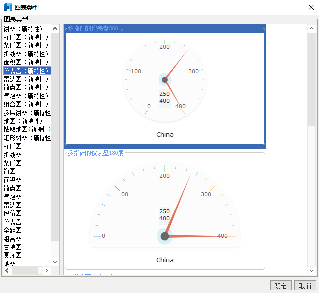 以单元格图表为例,合并一片单元格,点击插入>单元格元素>插入图表,弹出图表向导对话框,选择仪表盘(新特征),点击确定,如下图: