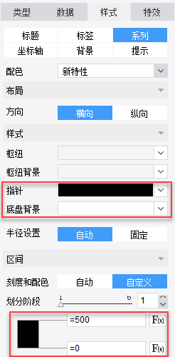 点击样式>系列>样式,指针颜色选择黑色,区间>刻度和配色,自定义选择黑色,如下图: