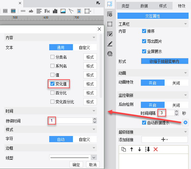 选中图表,点击特效>监控刷新,时间间隔选择3秒,勾选自动数据提示,设置提示内容和持续时间,如下图: