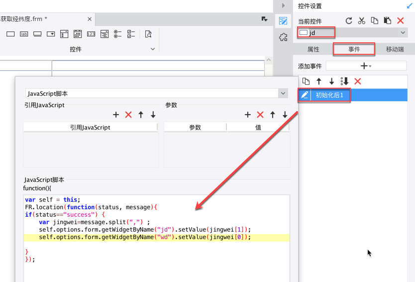 在决策报表中拖入两个文本控件,控件名分别为jd和wd,选中控件名为jd的文本控件,添加初始化后事件,如下图所示: