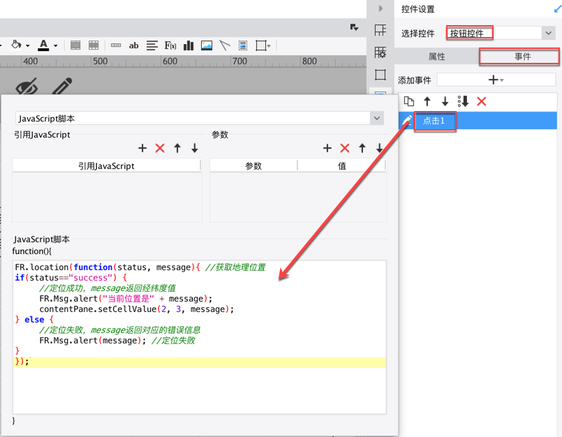 FineReport通过FR.location方法获取当前位置,如果status值为success,则表示获取地理位置成功,否则定位失败,如果定位成功,则将返回的地理位置信息赋值给C4单元格。