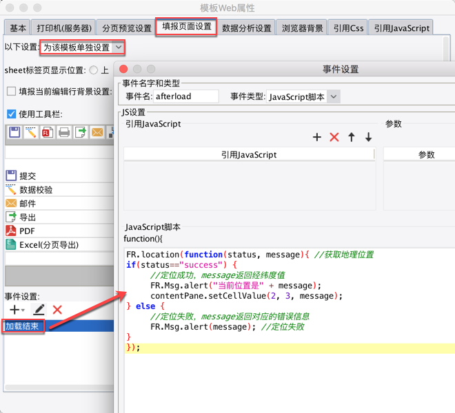 如果想在模板加载结束之后就获取到当前地理位置,那么只需要将上述代码添加到中即可,打开模板,点击模板>模板web属性>填报页面设置,添加一个加载结束事件,如下图: