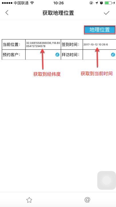 实现如下图所示效果,点击地理位置按钮获取当前位置与当前时间,并显示在下方对应的单元格中: