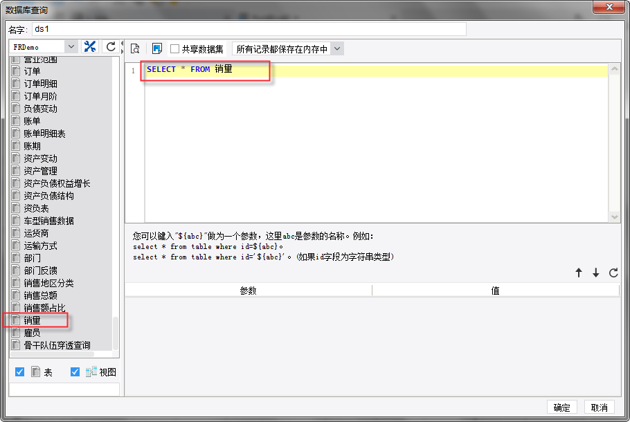 新建普通报表,添加模板数据集ds1,SQL语句为:SELECT * FROM 销量。如下图所示: