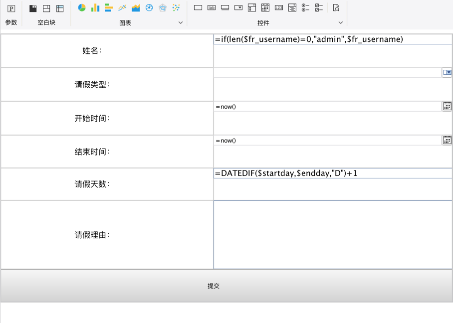 | 请假天数 | 文本控件 | day | DATEDIF($startday,$endday,"D")+1 | 无 |