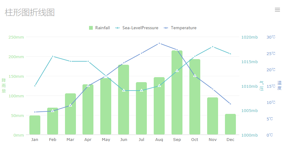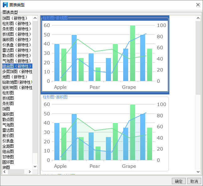 多种图表类型,可在一张图表混合显示。如图表中既存在柱形图,又有折线图或面积图,且各图表类型的纵坐标轴可设置在左或右,实现混合图表。如下图效果: