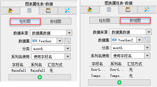 选中图表,在右侧图表属性表中选择图表属性表-数据,这里有柱形图和折线图两个选项卡,分别设置柱形图和折线图的图表数据,如下图所示: