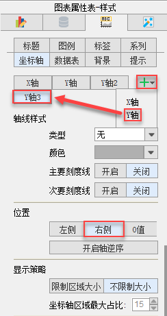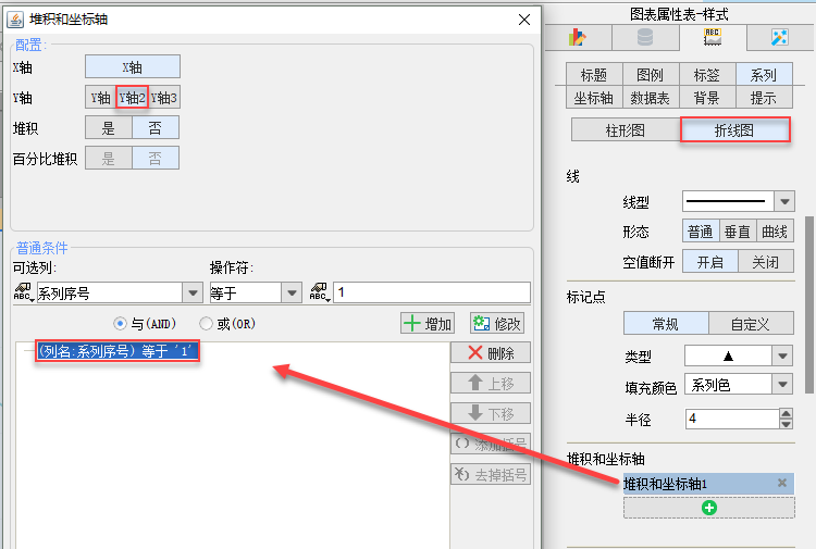 图表属性表-样式>系列,选择折线图,点击堆积和坐标轴1,选择Y轴2,添加系列序号等于1的条件,同时增加一个堆积和坐标轴2,选择Y轴3,添加系列序号等于2的条件,如下图:
