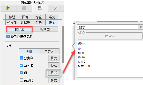 选择图表属性表-样式>提示>柱形图,编辑值的格式为数字且带mm单位。