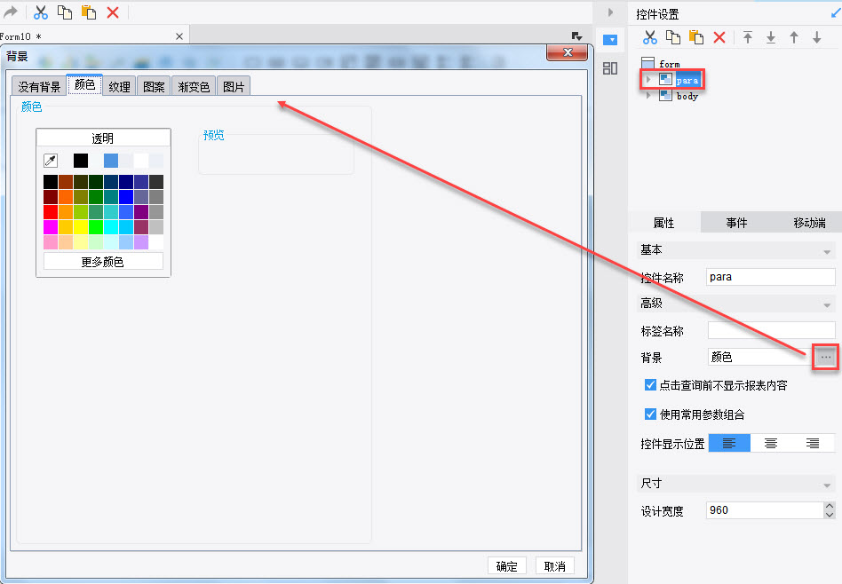 选中参数界面,在控件设置>高级中点击后面的按钮,修改背景颜色,如下图: