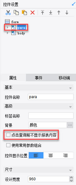 进入参数面板的编辑状态,在属性面板的控件设置中勾去“点击查询前不显示报表内容”,设置如下图: