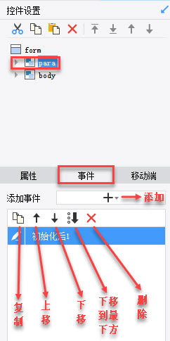 可以添加初始化后事件、点击事件,同时可以复制、上移、下移、下移到最下方、删除事件,如下图: