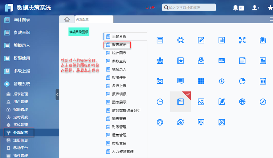 数据决策系统>管理系统>外观配置>样式>编辑目录图标中修改目录树图标,如下图: