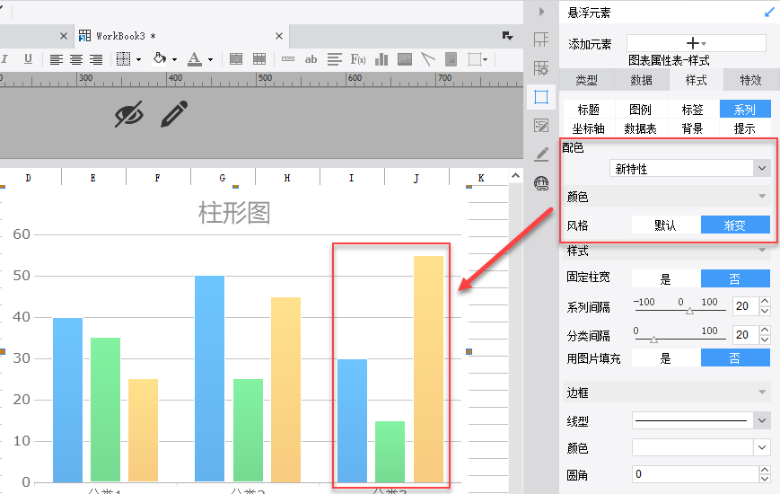 柱形图和条形图柱子的边框属性相同,可设置其线型、颜色和是否圆角。