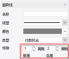 图表属性表-样式>系列>趋势线,如下图,选择粗线型、灰色、对数拟合,预测前推1周期,后推2周期: