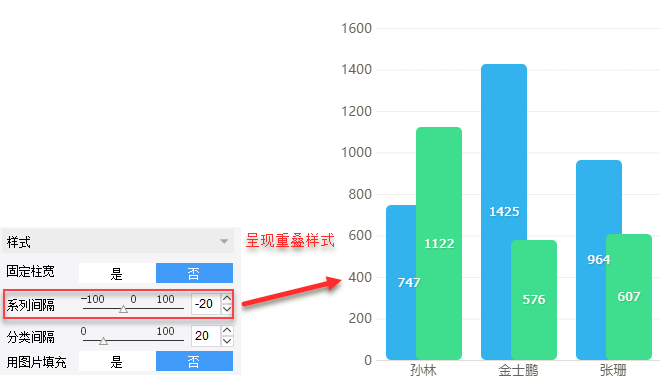系列间隔还可以是负数,柱子可实现重叠,效果如下: