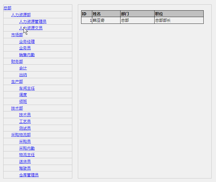 效果如下图所示(左侧是部门组织树,右侧是左侧某一部门的人员清单):